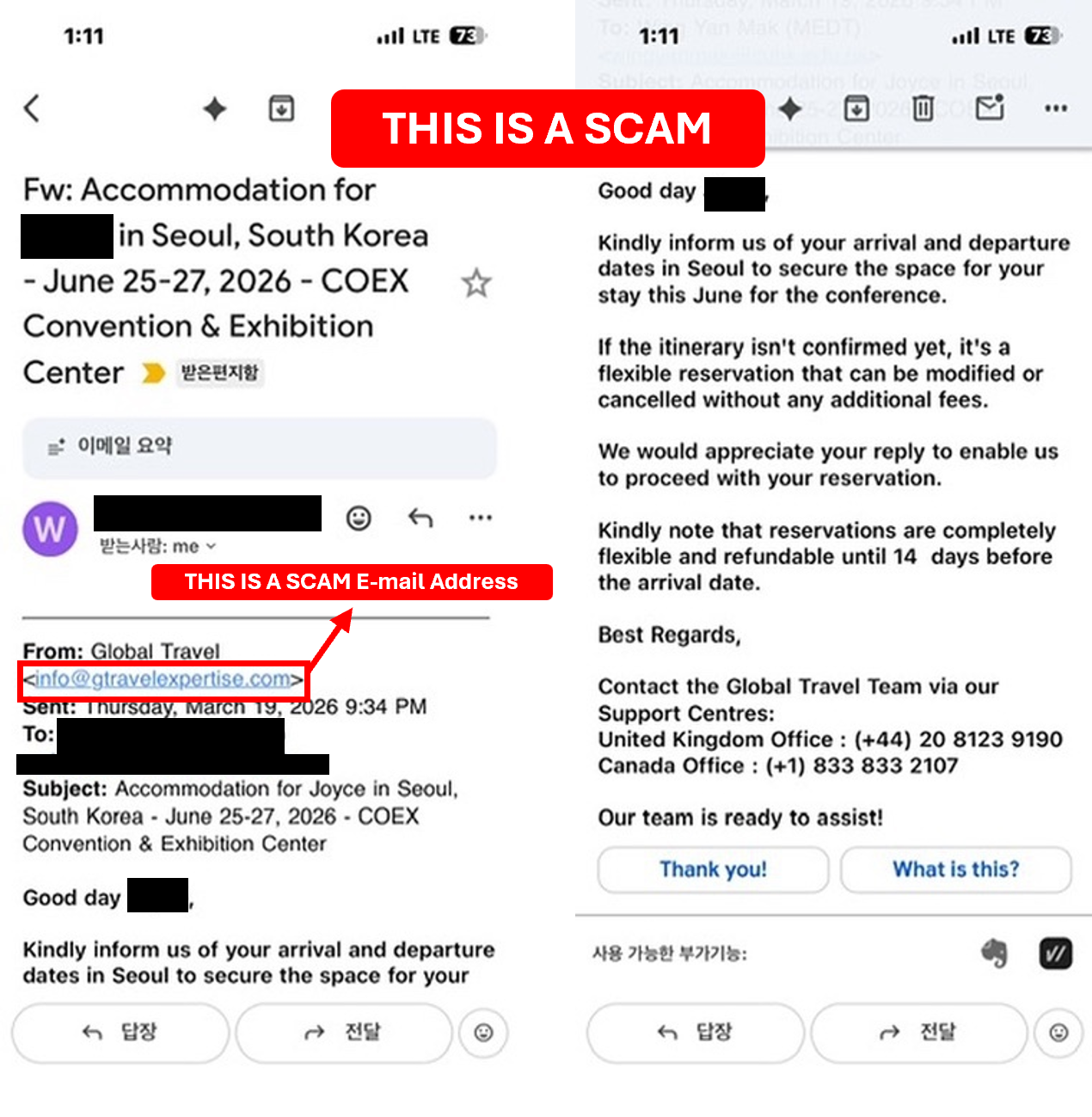 These scammers often pretend to be the official housing team or hotel staff. They will ask for your credit card details or personal information to "confirm" your stay. Please be very careful.
