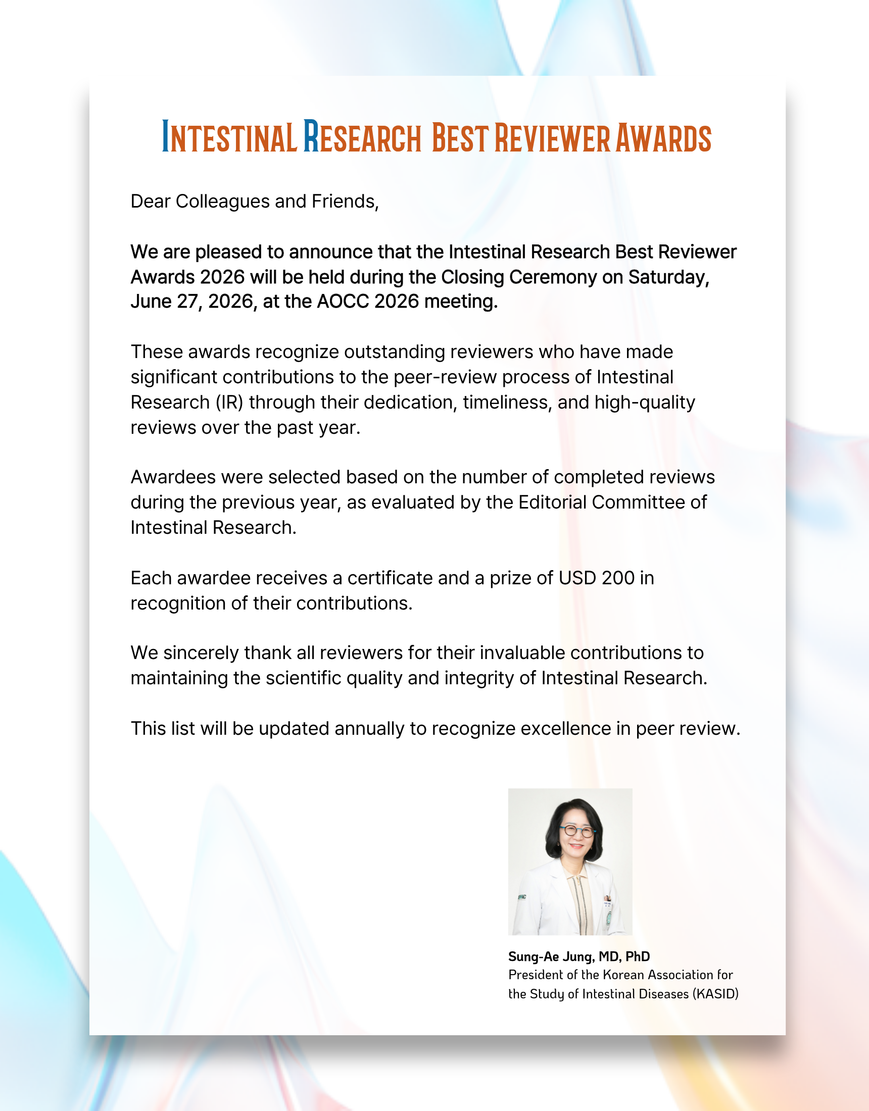[AOCC 2026] Intestinal Research Best Reviewer Awards